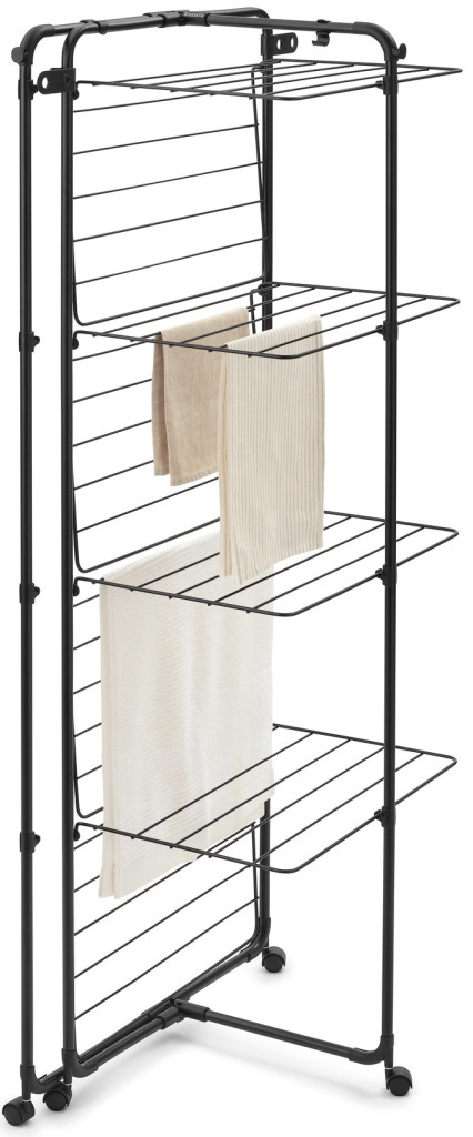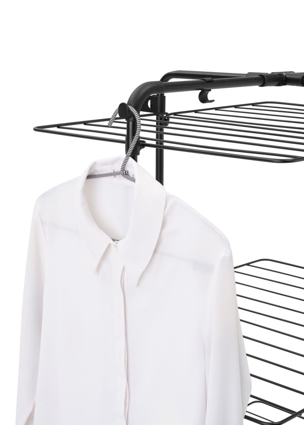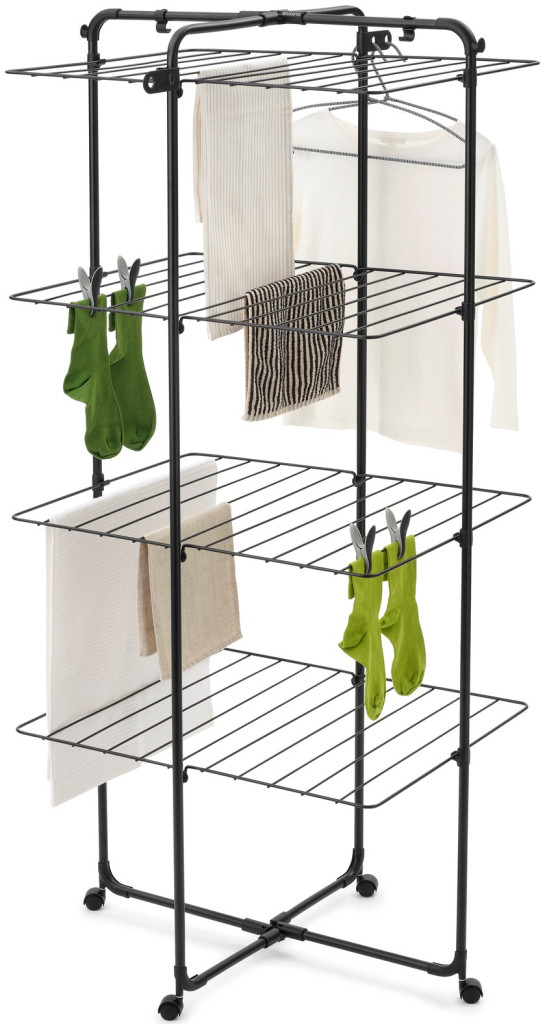 A hosszabb ruhadarabok – maxi szoknyák, nadrágok, lepedők – szárítása sem jelent gondot. Az alsó szintek lehajtásával elegendő függőleges tér nyílik a lógó szárításhoz, így a textíliák nem gyűrődnek össze, nem érintik a padlót. A felső szintek pedig ideálisak a kisebb darabokhoz: zoknik, fehérneműk, pólók számára.