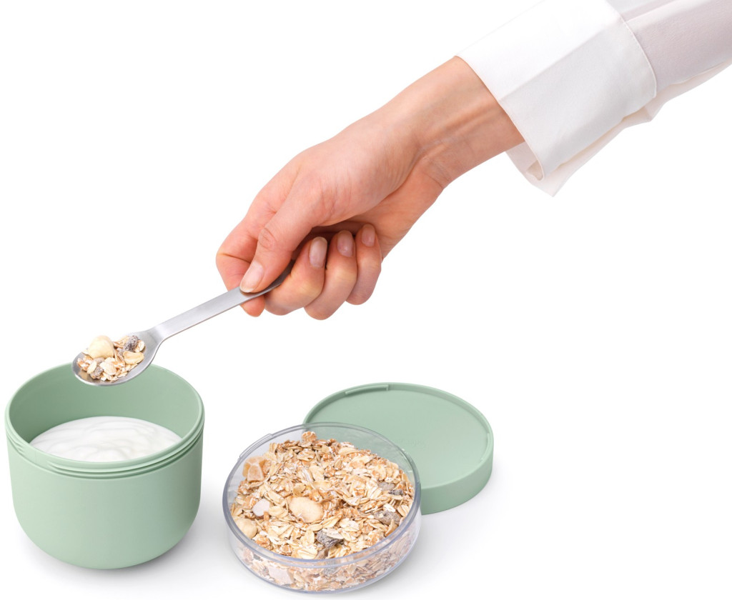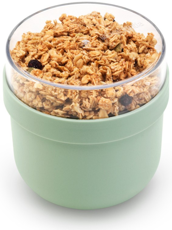 Az 500 ml-es főtartály kiváló alapot biztosít a teljes értékű reggeli ételek számára. Akár müzlit, joghurtot, zabkását vagy gyümölcsös túrót készít, a megfelelő mennyiség garantált. A felső részben elhelyezett 180 ml-es lecsavarható tárolórekesz különösen hasznos megoldás: itt tárolhatja külön a granolát, friss gyümölcsöket, magvakat vagy akár az önteteket is. Ez a szeparált tárolási lehetőség biztosítja, hogy minden összetevő megőrizze eredeti állagát és ízét a fogyasztás pillanatáig.