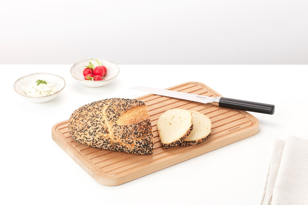 A másik oldal a bemélyedésekkel ellátott vágófelület, amely kifejezetten a kenyérszelésre lett optimalizálva. Ez a kettősség azt jelenti, hogy egyetlen eszköz két különböző szerepet tölt be, így kevesebb tárolóhelyre van szükség, és a konyha rendezettsége is megmarad.
