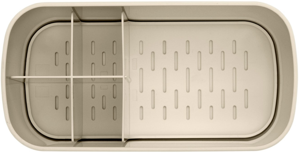 A perforált csepptálca lyukainak elrendezése és mérete szintén átgondolt: elég nagyok ahhoz, hogy a víz szabadon lefolyjon, de elég kicsik ahhoz, hogy még a kisebb tárgyak se csússzanak át rajtuk. Ez a részlet biztosítja, hogy a rendszerező használata közben ne kelljen aggódni amiatt, hogy valamelyik kisebb kellék a tálca alá esik.