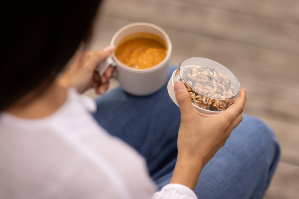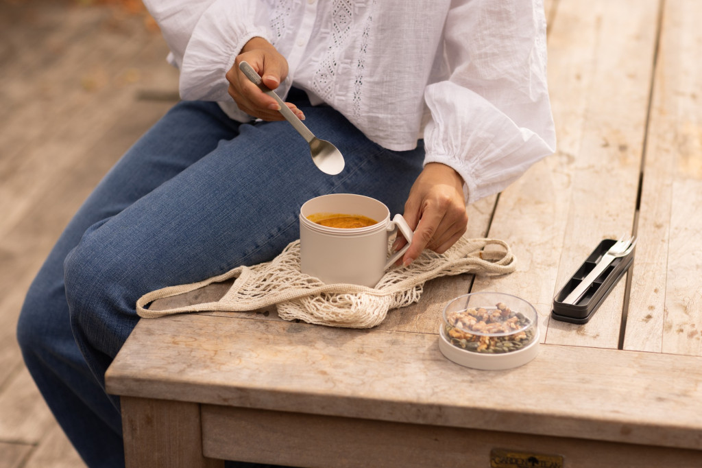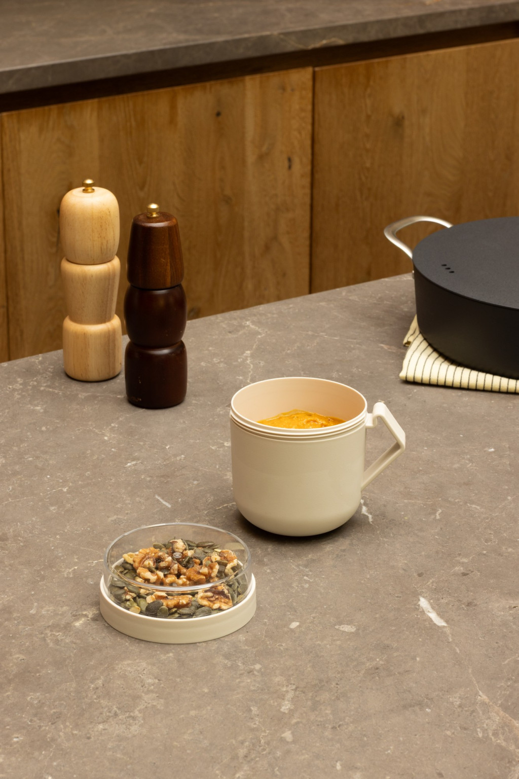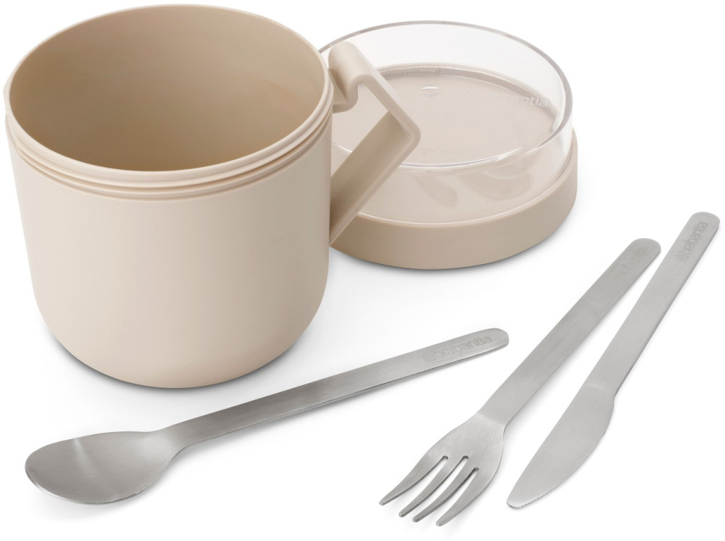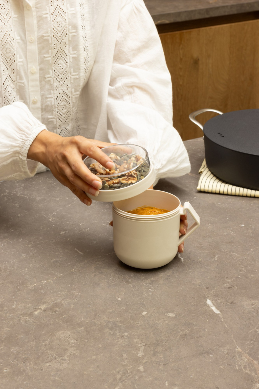 Brabantia Make & Take Soup Mug leveses bögre levesfeltét tároló fedővel, mikrózható, műanyag, 0,6L, világos bézs