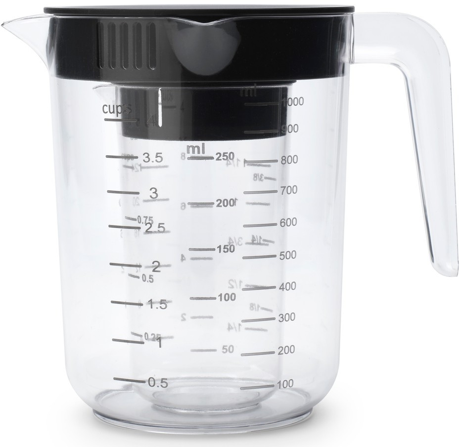 Zárt állapotban a fedő tökéletesen lezárja a mérőedényt, így az benne tárolt összetevők - legyen szó folyadékokról vagy száraz anyagokról - megőrizhetők a későbbi használatig. Ez különösen hasznos, amikor előre kimérjük a hozzávalókat, vagy amikor egy recepthez több lépésben kell ugyanazt az összetevőt hozzáadni. A fedél ergonomikus kialakítása könnyű nyitást és zárást biztosít, még nedves vagy lisztes kézzel is.