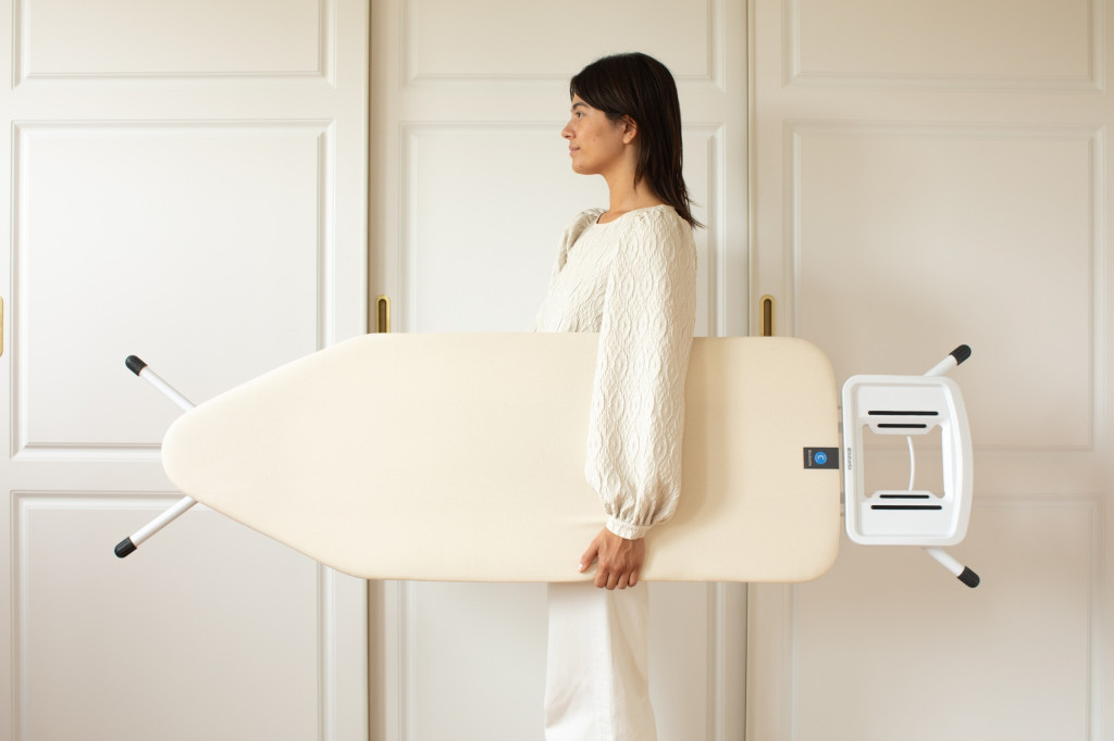 Amikor nem használja a vasalódeszkát, a szállítási zár segítségével könnyen összecsukható és mozgatható. Az összecsukott állapotban a deszka helytakarékos, így könnyen tárolható egy szekrényben vagy egy keskeny rés mellett. A fehér színű kivitel tiszta, semleges megjelenést biztosít, így még akkor is esztétikus, ha látható helyen tárolja.