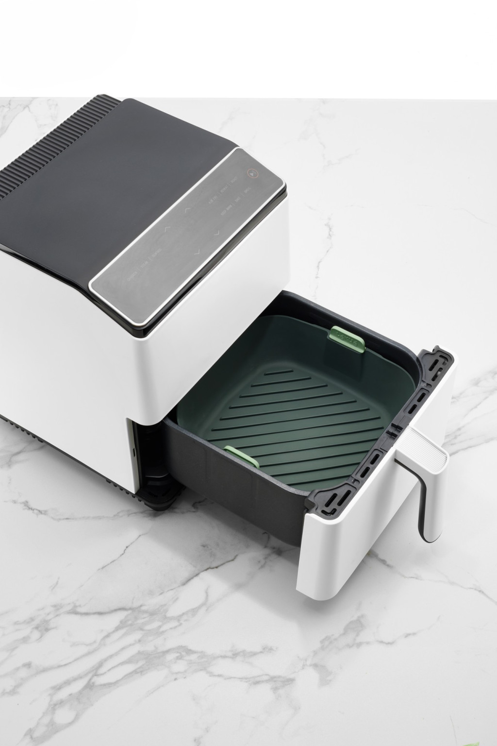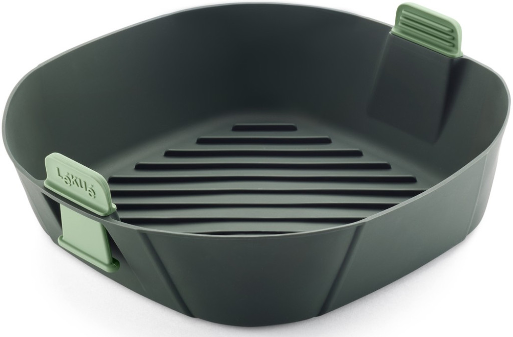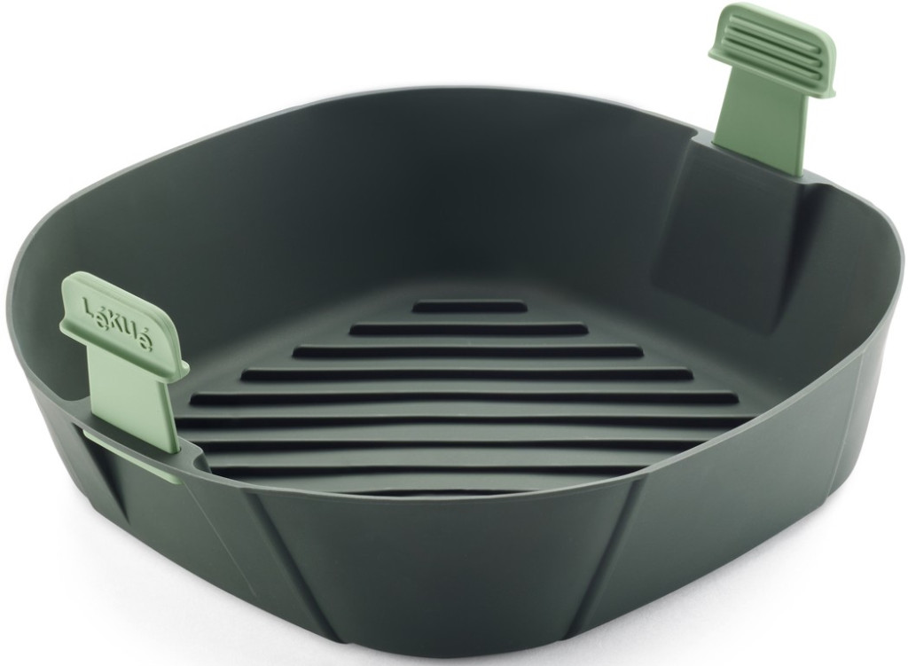 XL méretű forrólevegős air fryer kosár. Használd ki a forrólevegős fryer teljes főzési kapacitását az alkalmazkodó kosárkialakítással. Emelje fel a fogantyúkat, hogy több hely legyen a keze és a forrólevegős fryer között. Ennek a forrólevegős fryernek a kosara alján egy vízelvezető minta található, amely elválasztja a zsírt az ételtől, így tökéletesen ropogós eredményt érhet el. 100% szilikonból készült. BPA-mentes. Tökéletes 5 literes és 6,5 literes légkeveréses frryerekhez. Ideális kis vagy lédús ételek, például sült krumpli vagy brokkoli elkészítéséhez a légkeveréses fritőzben! Mindig viseljen védőkesztyűt vagy védőruhát az égési sérülések kockázatának teljes elkerülése érdekében.