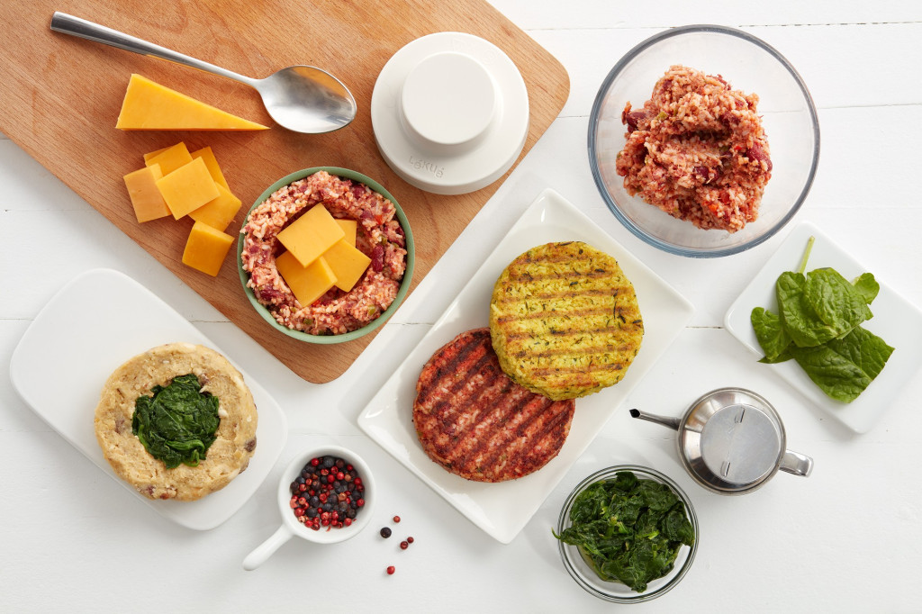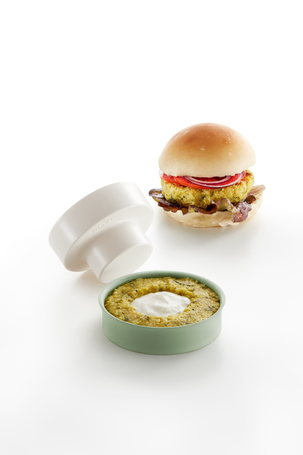 Lékué Veggie Burger Mould zöldség burgerpogácsa formázó, D=11,1cm, szilikon, műanyag, fehér/zöld